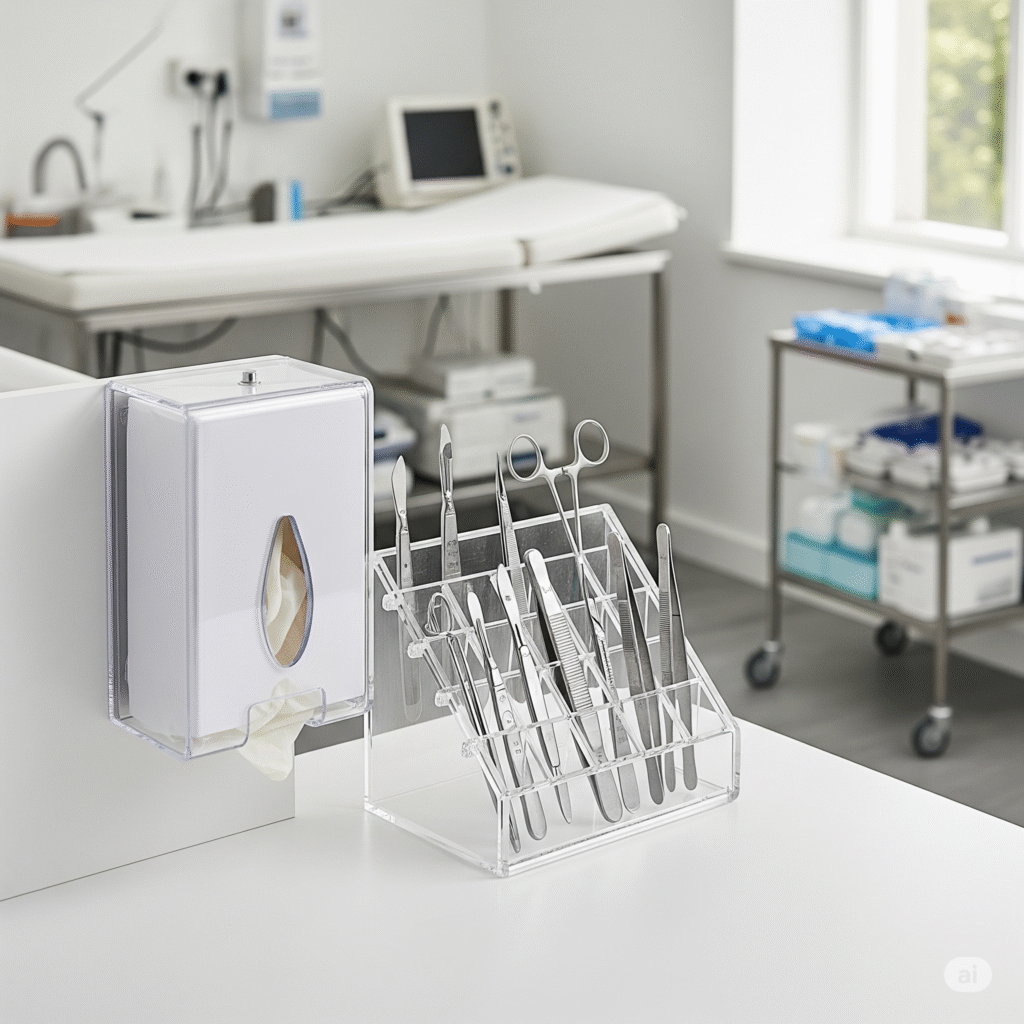 Klinik ortamlarda hem hijyeni hem de düzeni bir arada sağlayın. Medikal aletler için özel düzenleyiciler, eldiven veya maske gibi sarf malzemeleri için hijyenik dispenser kutuları ve bekleme alanları için şeffaf koruyucu seperatörler üretiyoruz. Bu çözümler, günlük iş akışınızı hızlandırırken hasta ve personel güvenliğine de katkıda bulunur.